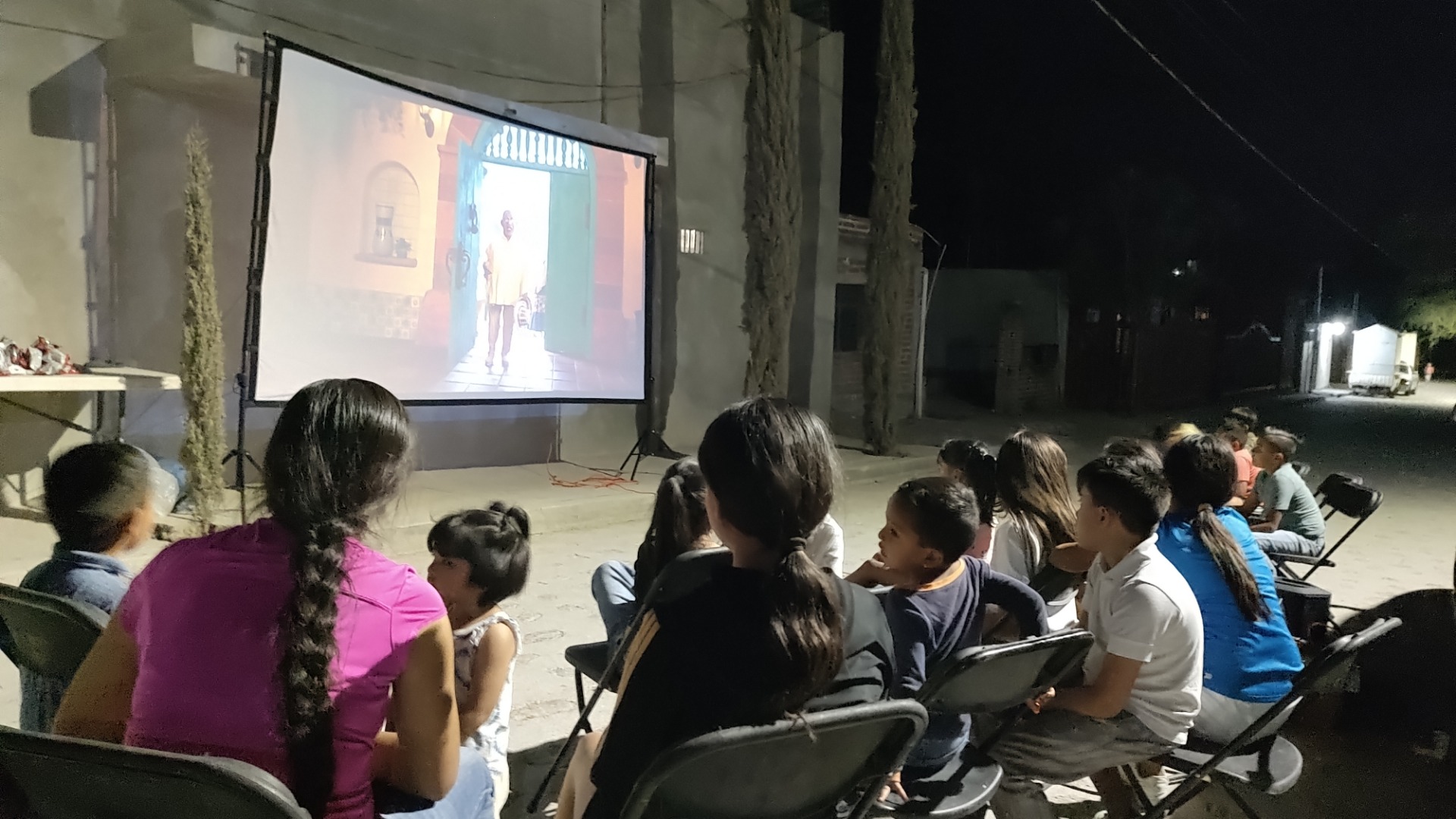 Cada semana realizamos un cine móvil en los distintos barrios de Mezquitic. Es una