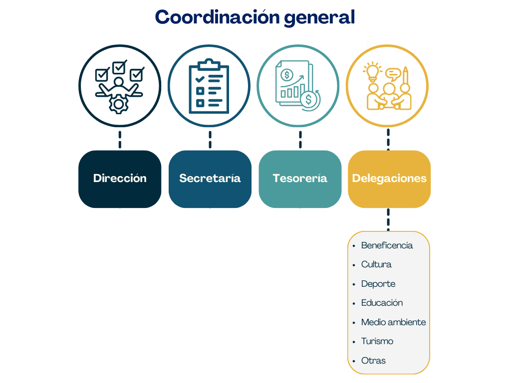Estamos estructurados en delegaciones que cubren las distintas áreas de trabajo y una coordinación general que integran los representantes de estas, la dirección, la secretaría y la tesorería.